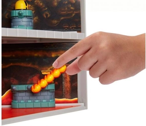 Das Deluxe-Spielset Super Mario und Bowsers Schloss mit Sound ermöglicht es dir, dieses klassische Level aus den Super-Mario-Videospielen zu erkunden. Zum Spielset gehören exklusive 9-cm-Figuren von Bowser in einer interaktiven Umgebung mit funktionierenden Mechanismen und authentischen Spielgeräuschen. Du kannst den Aufzug nach oben und unten bewegen, die Feuerbälle drehen lassen, den Boden des Käfigs öffnen und Bowser besiegen, indem du die Falltür auslöst und ihn in die darunterliegende Lava stürzt.