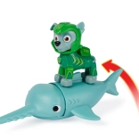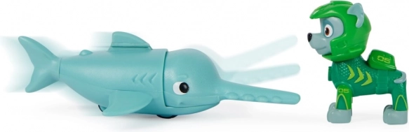 Rocky im nagelneuen Neoprenanzug und sein treuer Freund, der Sägefisch. Setze Rocky auf die Rückenflosse des Sägefischs, schiebe den Sägefisch nach vorne, um die Kopfbewegungen zu aktivieren, und starte zur Rettungsaktion. Geeignet ab 3 Jahren.