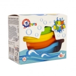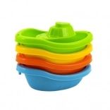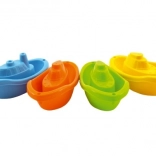 Das Set enthält vier Boote in leuchtenden Farben – Blau, Orange, Grün und Gelb –, die sich leicht stapeln lassen für eine einfache Aufbewahrung. Form und Farben der Boote fördern die Vorstellungskraft und Kreativität der Kinder beim Wasserspiel.
