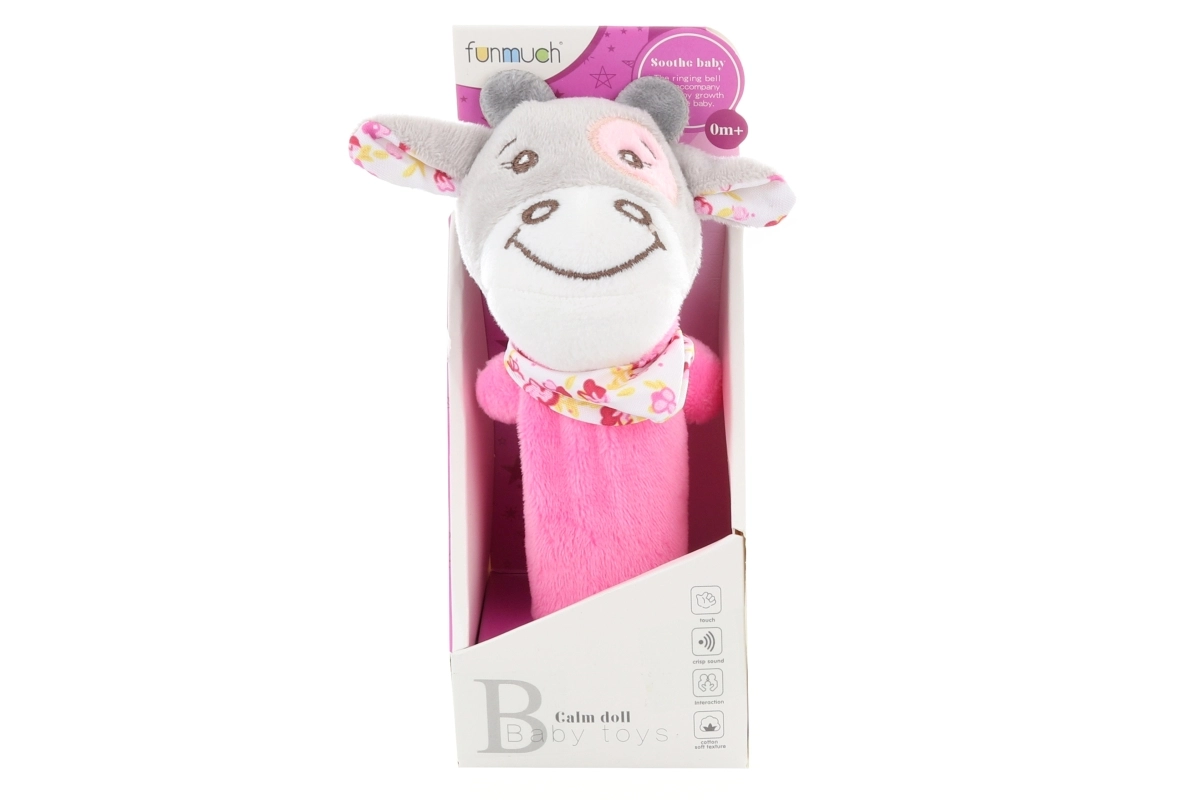 Dieses quietschende Rasselspielzeug in Form einer rosa Kuh ist weich im Griff und für die kleinsten Nutzer konzipiert. Beim Drücken erzeugt es einen sanften Quietschton, der die Aufmerksamkeit weckt und die Hörentwicklung unterstützt. Dank der kompakten Maße lässt es sich leicht halten und ist ideal zum Training der Feinmotorik und des Greifens.