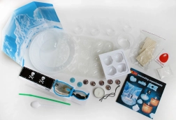 Die Box umfasst eine bunte Auswahl an Werkzeugen und Materialien: Eisformen, Knetmasse, Kerze, kleine Steine, Becher, Trinkhalm, Lebensmittelfarbe, Schablonen, Faden und weiteres Zubehör. Eine leicht verständliche tschechische Schritt-für-Schritt-Anleitung ist ebenfalls enthalten, sodass Kinder fast sofort mit dem Experimentieren beginnen können.