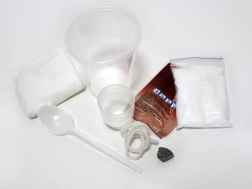 Becherglas, Plastikbecher, Löffel, Wollfaden, Papiertaschentuch, Stein