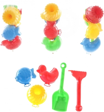 Unterhaltsames Sandspiel-Set für kleine Baumeister mit Schaufel, Harke und drei Förmchen. Leicht, einfach zu tragen und im Netz verpackt – ideal für den Spielplatz und den Strand.