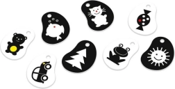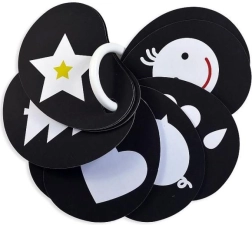 Schwarz‑weiße Motive mit starken Konturen helfen Babys ab 3 Monaten besser zu fokussieren und die visuelle Wahrnehmung zu entwickeln.