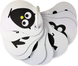 Dank des Kunststoffrings bleiben die Kärtchen zusammen, lassen sich leicht transportieren und können vom Baby sicher gegriffen werden. Das sanfte, aber robuste Papier liegt angenehm in der Hand und hält häufigem Anschauen stand. Das Spiel entstand unter fachlicher Begleitung der Psychologin Alexandra Petrovska von der Universität Warschau und gehört zur beliebten Serie Eulchen – kluges Köpfchen.