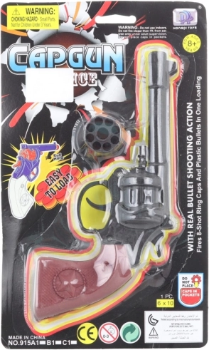 Western-Knallpistole mit 8-schüssiger Trommel. Leichtes, einfach zu bedienendes Spielzeug für actionreichen Kinderspaß. Verpackungsmaße 25,5 × 15 × 3,5 cm.