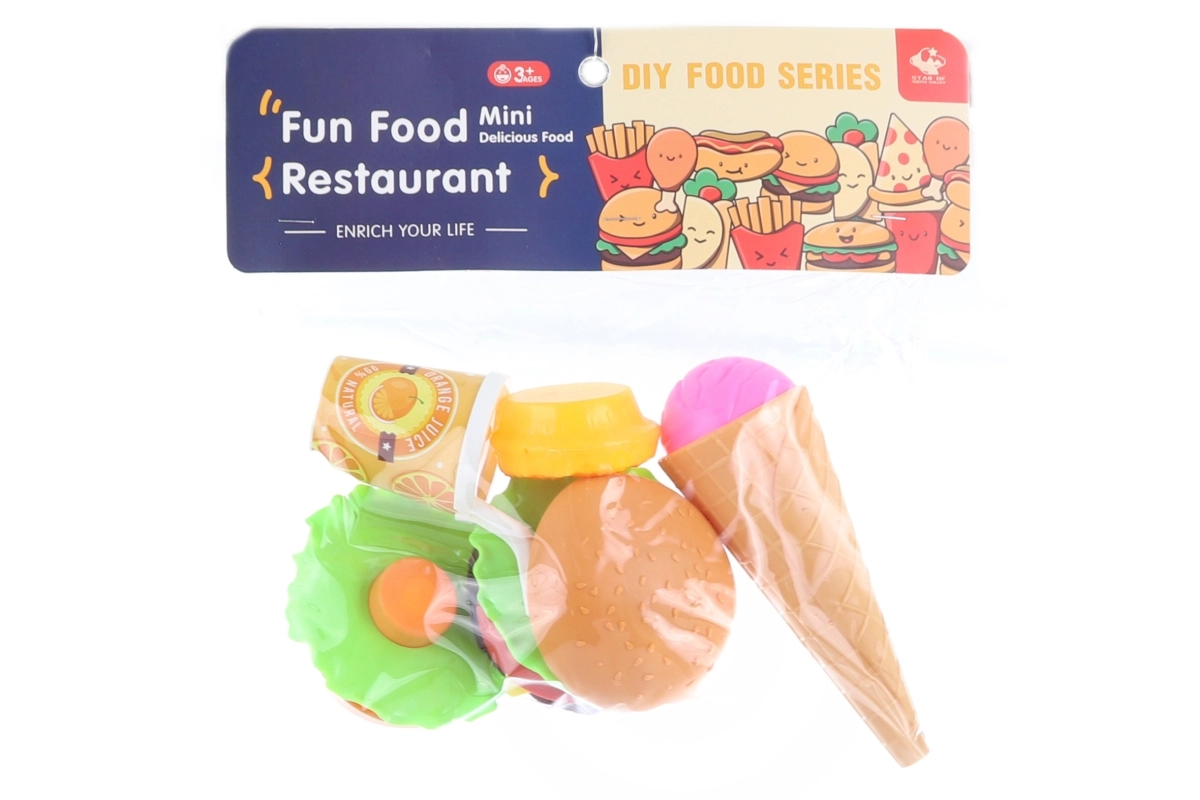 Dieses spielerische Set aus Kunststoff-Lebensmitteln ist die perfekte Ergänzung für die Kinderküche. Kinder können ihren eigenen Hamburger zubereiten, Eis anbieten, Kuchen genießen und dazu ein Getränk servieren. Die Teile sind leicht und sicher für kleine Hände.