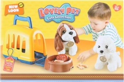 Im Lieferumfang enthalten sind ein Plüschhund mit einer Größe von ca. 18 × 12 cm, eine Kunststoff-Transportbox (20 × 21 × 13 cm), ein Napf und Futter. Alles ist auf kleine Kinderhände zugeschnitten und lässt sich leicht transportieren.