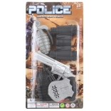 Komplettes Polizeiset für kleine Gesetzeshüter mit sicheren Zubehörteilen für kreatives Spielen. Enthält eine Saugpistole, 3 Saugnapf-Pfeile, eine Granate, ein Funkgerät, ein Fernglas und einen Abzeichen. Ideal für Kinder ab 3 Jahren, hergestellt aus robustem Kunststoff.