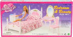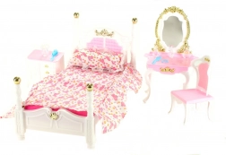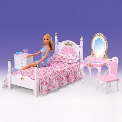 Das Glorie-Schlafzimmer enthält ein Kunststoffbett mit den Maßen ca. 16 cm × 34 cm × 18 cm mit Bettüberwurf und Kissen, einen Schminktisch mit den Maßen ca. 13 cm × 8 cm × 22 cm mit Zubehör für Puppen – Kamm, Armband, Bürste und Fläschchen –, einen Sessel ca. 7 cm × 7 cm × 13 cm sowie einen Nachttisch ca. 8,5 cm × 6 cm × 8 cm. Puppe nicht im Lieferumfang enthalten. Ab 3 Jahren.