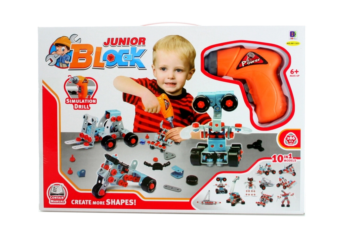 Fördern Sie Kreativität und Feinmotorik mit dem vielseitigen Junior Block Baukasten. Das Set enthält 286 Teile inklusive einer simulierten Akku-Bohrmaschine und ermöglicht Kindern ab 6 Jahren den Bau von bis zu 10 verschiedenen Modellen wie Fahrzeugen, Robotern und weiteren Konstruktionen. Die praktische Verpackung (ca. 41 × 29 × 6 cm) und das einfache Verschrauben mit Kunststoffschrauben und -muttern sorgen für stundenlangen Spielspaß. Die Bohrmaschine wird mit 2× AA-Batterien betrieben (nicht enthalten).