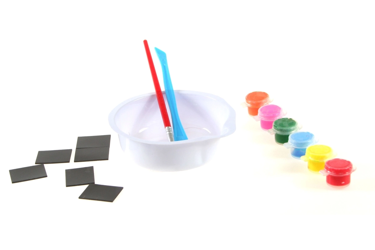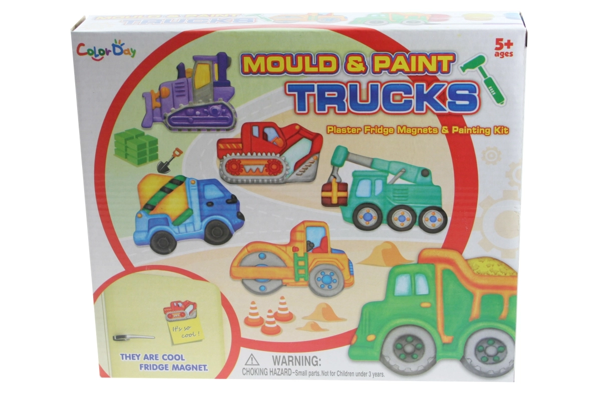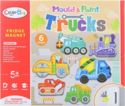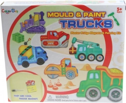 Verwandeln Sie Basteln in ein Abenteuer auf der Baustelle. Mit diesem Set gießen Kinder Gipsmagnete in eine Form mit 6 Motiven von Baufahrzeugen, bemalen sie mit den beiliegenden Farben und gestalten mithilfe der Magnete fröhliche Deko für den Kühlschrank oder die Magnettafel.