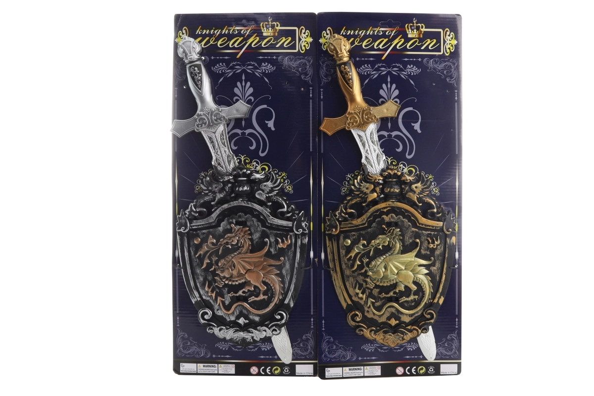 Plastikschwert mit einer Länge von ca. 49 cm und Schild mit den Maßen ca. 26 x 19 cm. Verpackungsmaße ca. 52,5 x 21 x 2 cm. Alter 3+