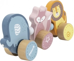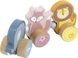 Elefant, Fuchs und Löwe, miteinander verbunden zu einem kleinen Zug, regen die Fantasie an und laden zu kreativem Spiel ein.