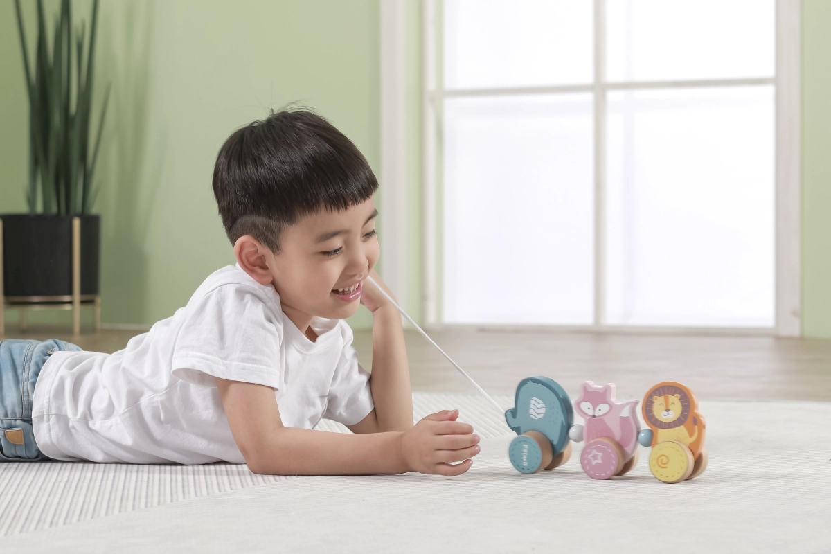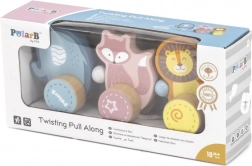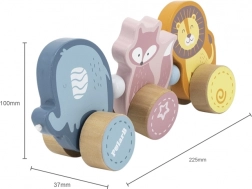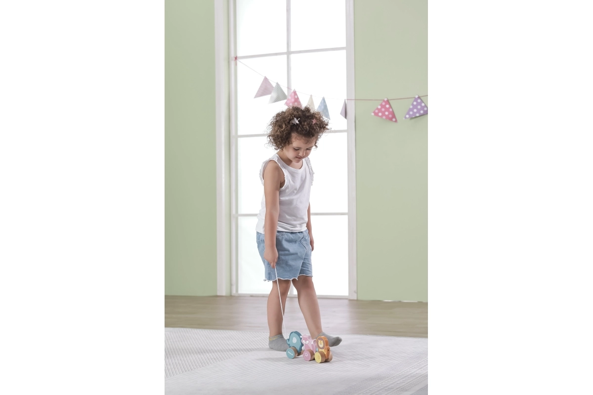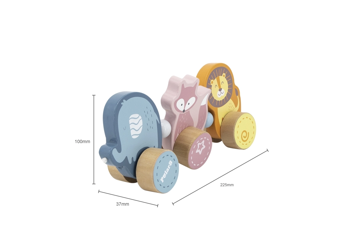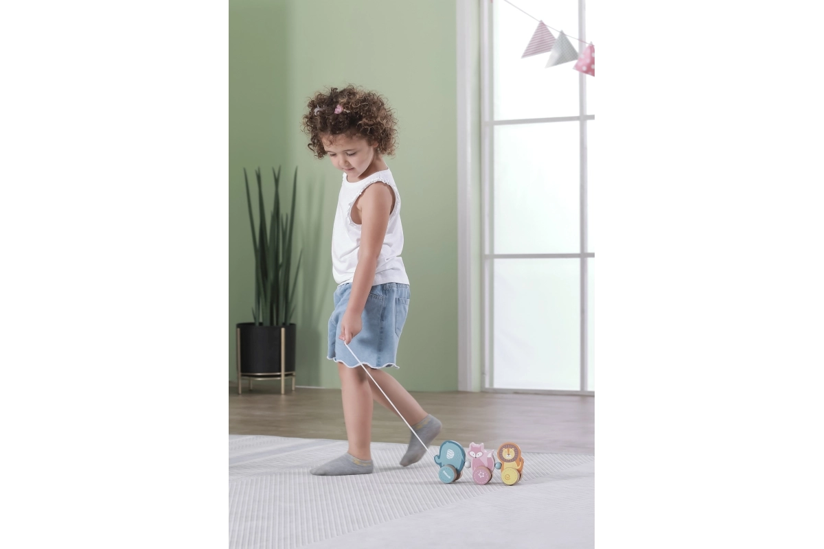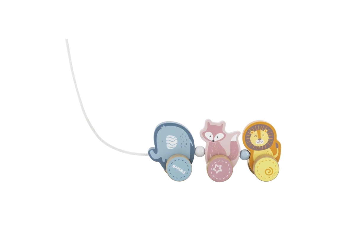 Dieses hochwertige Holz-Ziehtier in zarten Pastellnuancen ist für kleine Kinder konzipiert, die das Laufen lernen und die Welt entdecken. Drei niedliche Tiere – Elefant, Fuchs und Löwe – sind verbunden und rollen sanft auf Holzrädern. Dank des robusten Zugseils lassen sich die Spielzeuge leicht führen, motivieren Kinder zur Bewegung und fördern ganz natürlich Gleichgewicht und Koordination.