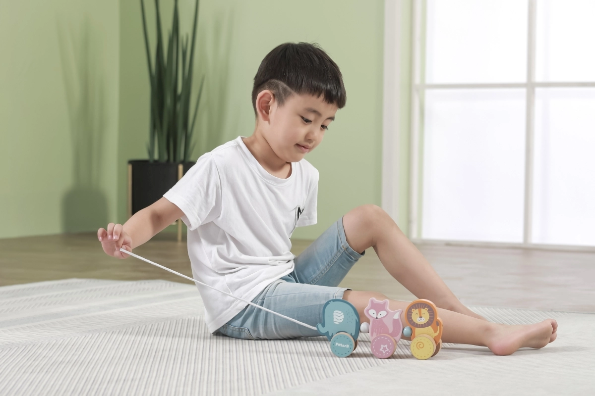 Ein fester Zugfaden und leichtgängige Räder geben Kindern mehr Sicherheit beim Laufen und unterstützen natürliche Bewegung beim Spiel.