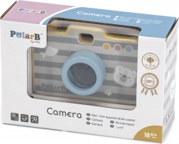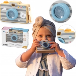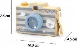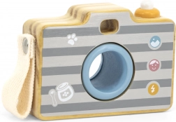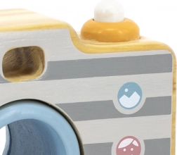 Das Spielzeug besteht aus hochwertigem Holz und ist mit ungiftigen, kindersicheren Farben versehen. Die robuste Verarbeitung, glatte Kanten und ein seitlicher Griff sorgen für eine bequeme und sichere Handhabung. Die Kamera fördert Feinmotorik, Koordination und Kreativität beim Rollenspiel.