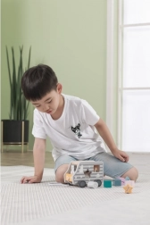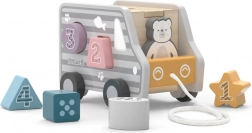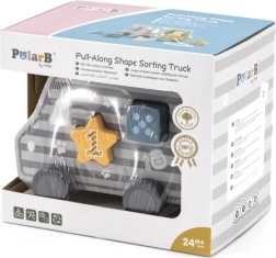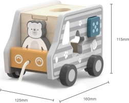 Holz-Ziehtier und Steckspiel in Form eines Lastwagens. Maße ca. 18 × 12 × 6,5 cm. Verpackungsmaße ca. 19 × 16,5 × 13,5 cm. Alter 18+ Monate