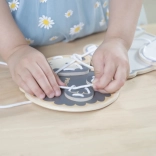Glatte Holzteile mit sicheren Öffnungen und robusten Schnüren. Ideal für das tägliche Üben der Feinmotorik.