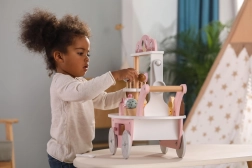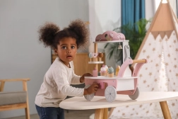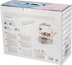 Der 3-in-1 Kinder-Holzstand POLARB von VIGA verwandelt jedes Zimmer in ein süßes Königreich. Dank der fahrbaren Ausführung, der kleinen Glocke und des bunten Sets aus hölzernen Leckereien trainieren Kinder Kreativität, Kommunikation und Rollenspiel als Verkäufer oder Konditor. Die zarte Pastellpalette und die sorgfältige Verarbeitung laden immer wieder zum Spielen ein.