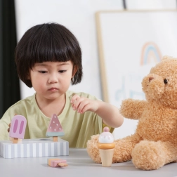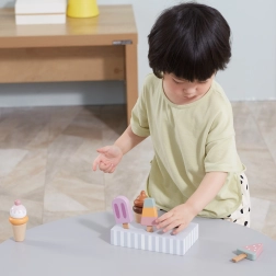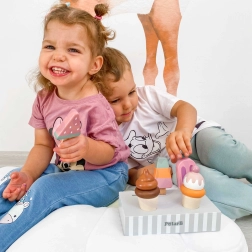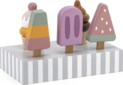 Fünf verschiedene Eis am Stiel inspirieren Kinder zu Rollenspielen, erweitern den Wortschatz und fördern soziale Fähigkeiten beim gemeinsamen Spiel.