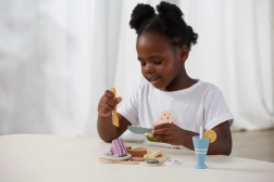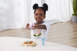 Bunte Essensstücke, Dessert und Getränk ermöglichen Kindern, wie in echt zu servieren und grundlegende Tischsitten zu üben.