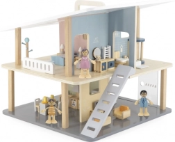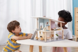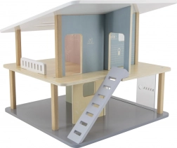 Dieses moderne Holz-Puppenhaus bietet Kindern Raum für freies Spiel und die Entfaltung der Fantasie. Die offene Konstruktion ermöglicht leichten Zugang zu allen Räumen, zwei Etagen und die Terrasse laden zur Gestaltung eigener Geschichten ein. Dank des tragbaren Designs lässt es sich leicht umstellen und verstauen.