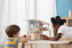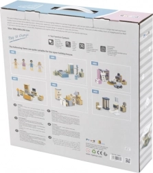 Das Interieur kann mit thematischen Möbel-Sets (Küche, Wohnzimmer, Schlafzimmer, Kinderzimmer und Bad) ergänzt werden, die die Spielmöglichkeiten erweitern und das Lernen über den Haushalt unterstützen.