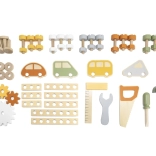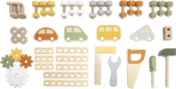 • Umfangreiches Zubehör: Werkzeug, Schrauben, Muttern, Plättchen, Zahnräder, Auto und Uhr mit Zeigern.