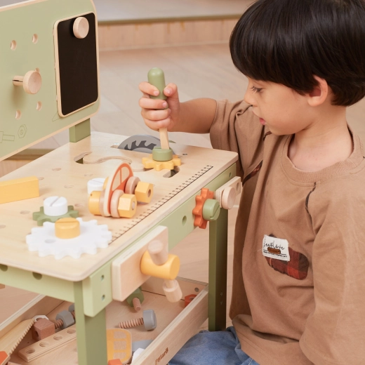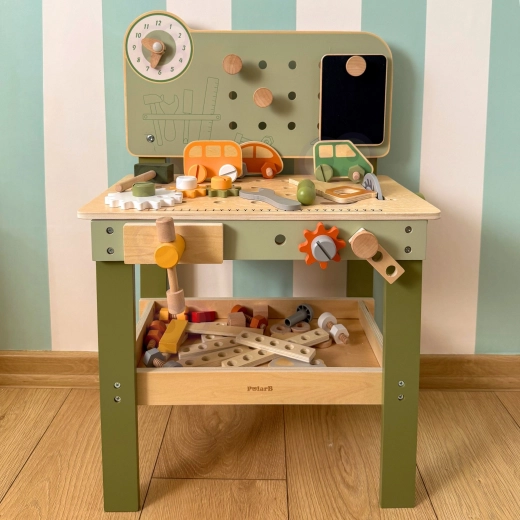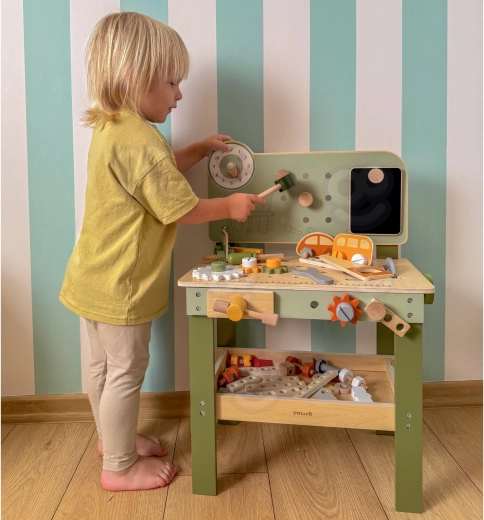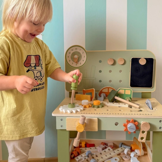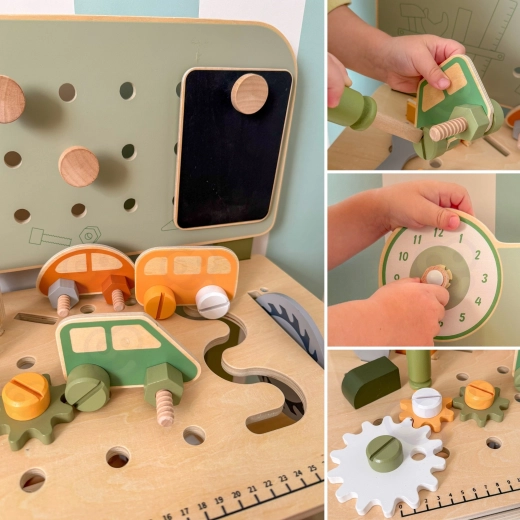 Enthalten ist ein Werkzeugsatz (Hammer, Schlüssel, Schraubendreher), Schrauben, Muttern, Zahnräder, eine Tafel mit Lernuhr und ein praktisches Ablageregal. Kinder können eigene Kreationen bauen, „reparieren“ und Teile sortieren – ideal zur Förderung von Kreativität, Geduld und Planung.