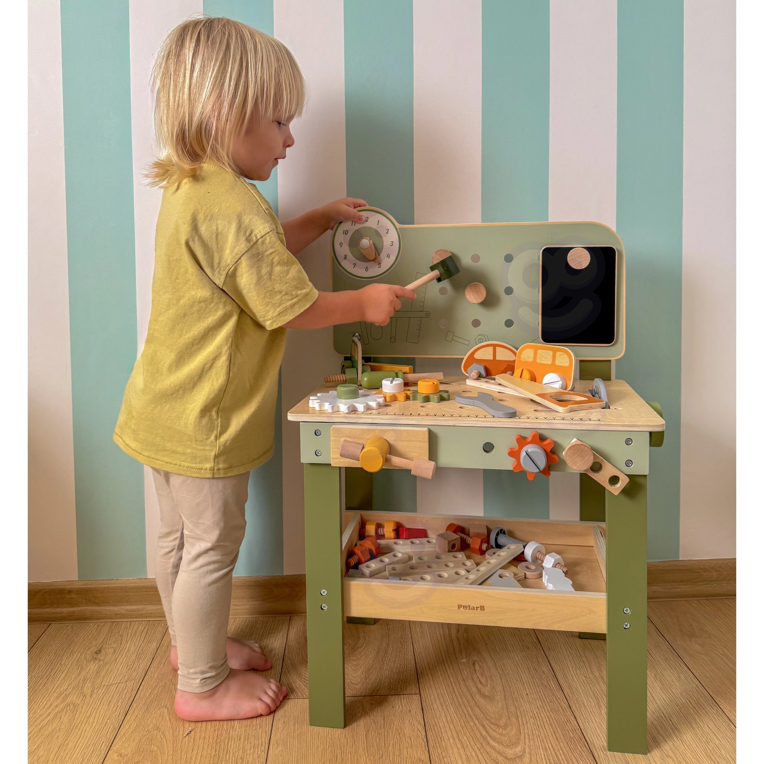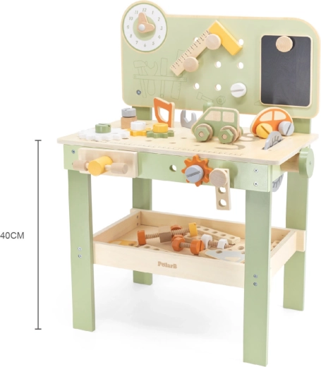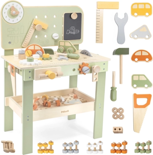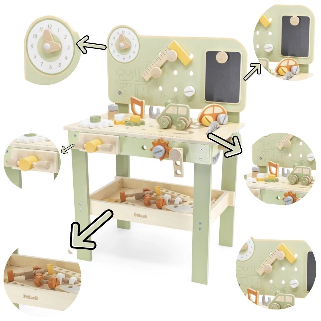 Die große Holzwerkbank Viga PolarB macht aus Spiel kreatives Lernen. Kinder können Holzdübel einschlagen, Schrauben anziehen und Teile zusammensetzen und fördern dabei Feinmotorik und Vorstellungskraft. Die Werkbank hat Lernuhr, Aufbewahrungsmöglichkeiten für Werkzeug und besteht aus hochwertigem Holz mit sicheren, ungiftigen Farben – für täglichen Spaß und Entwicklung.