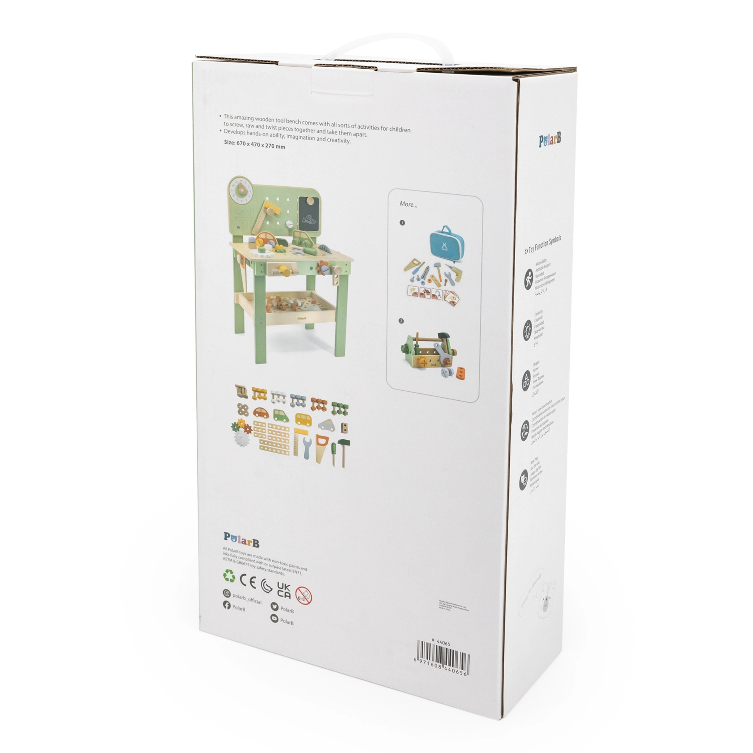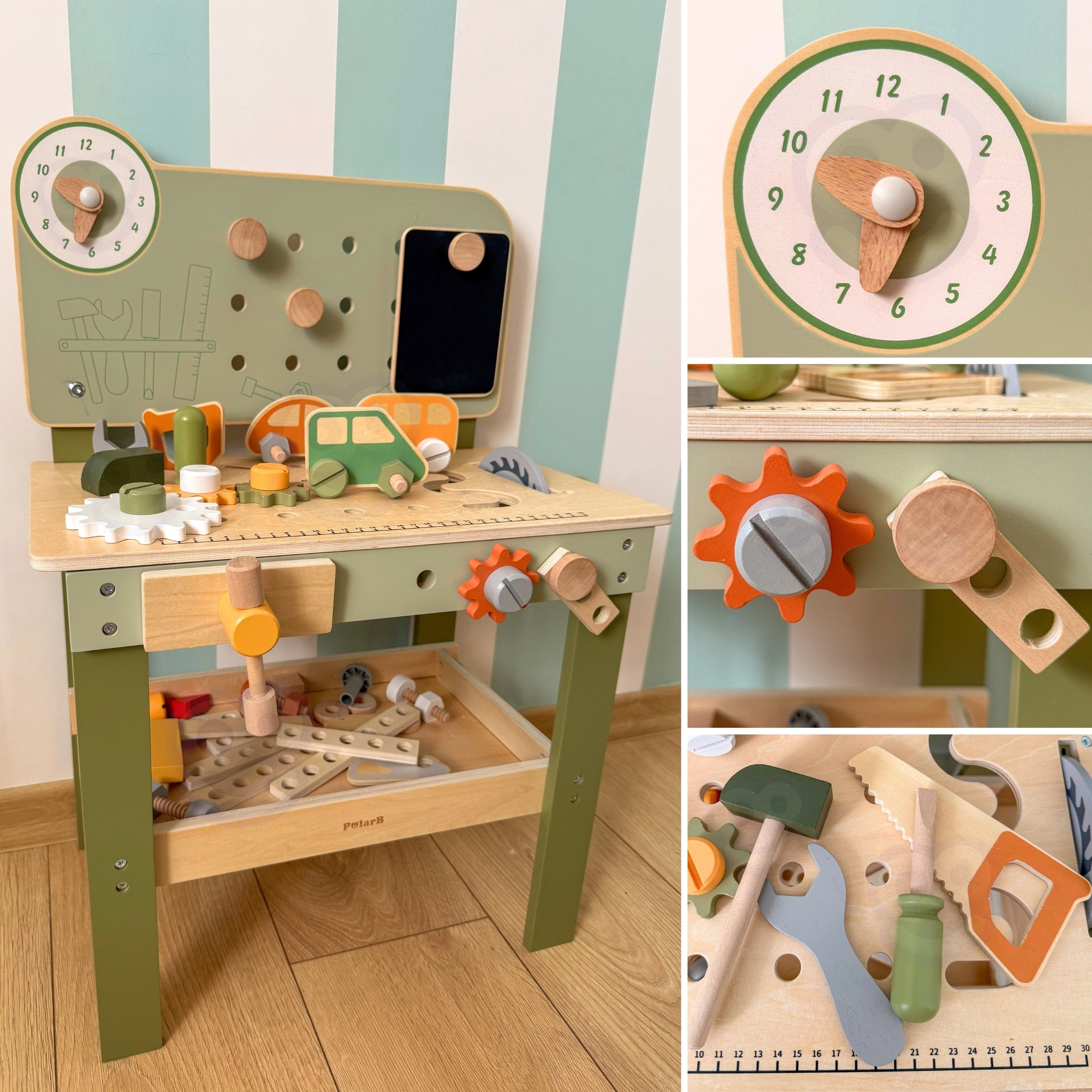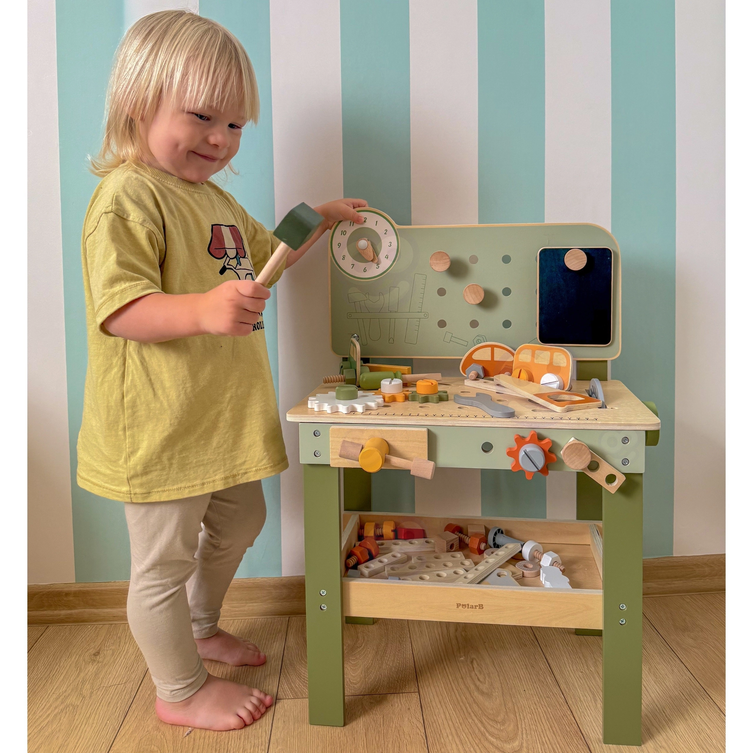 Die große Holzwerkbank Viga PolarB macht aus Spiel kreatives Lernen. Kinder können Holzdübel einschlagen, Schrauben anziehen und Teile zusammensetzen und fördern dabei Feinmotorik und Vorstellungskraft. Die Werkbank hat Lernuhr, Aufbewahrungsmöglichkeiten für Werkzeug und besteht aus hochwertigem Holz mit sicheren, ungiftigen Farben – für täglichen Spaß und Entwicklung.