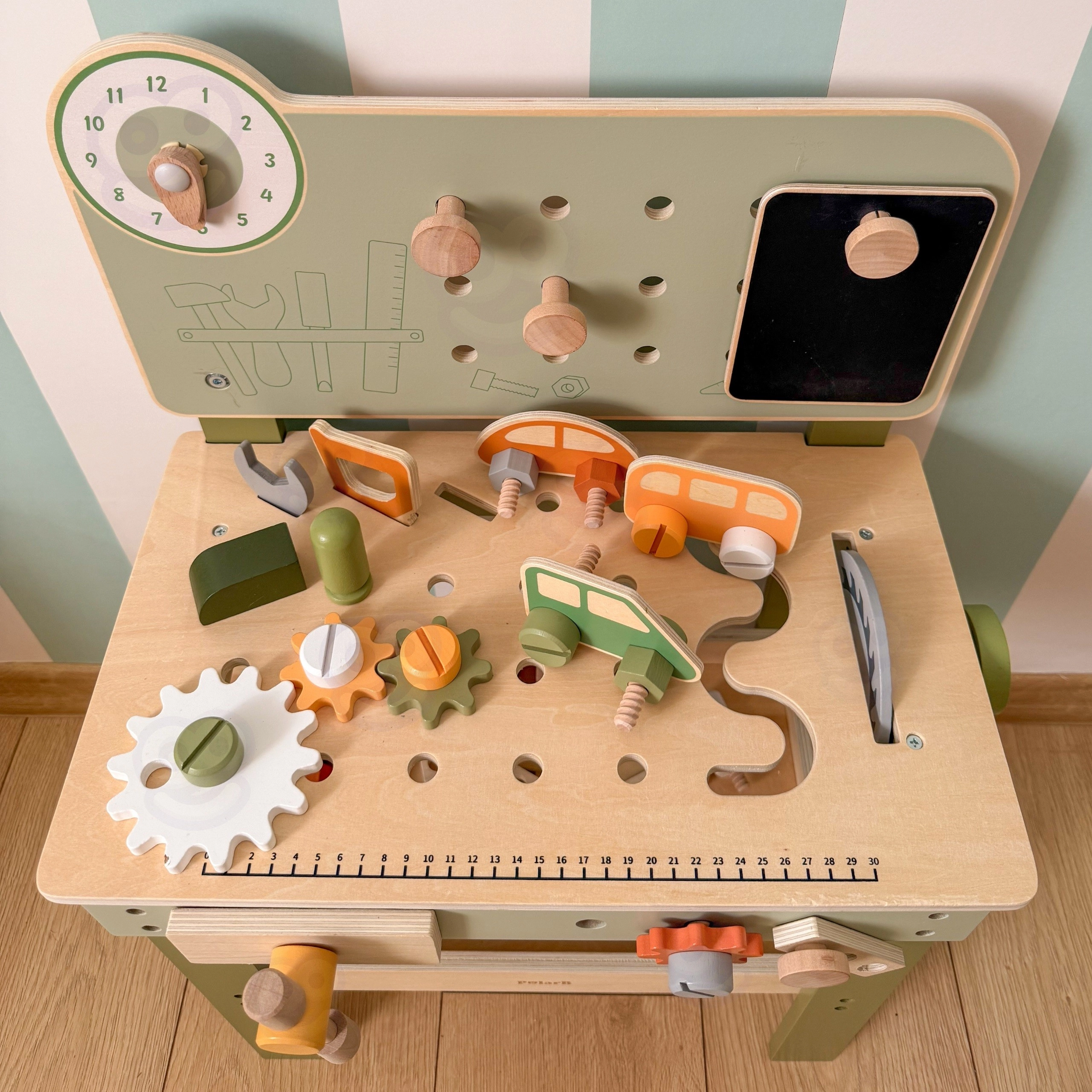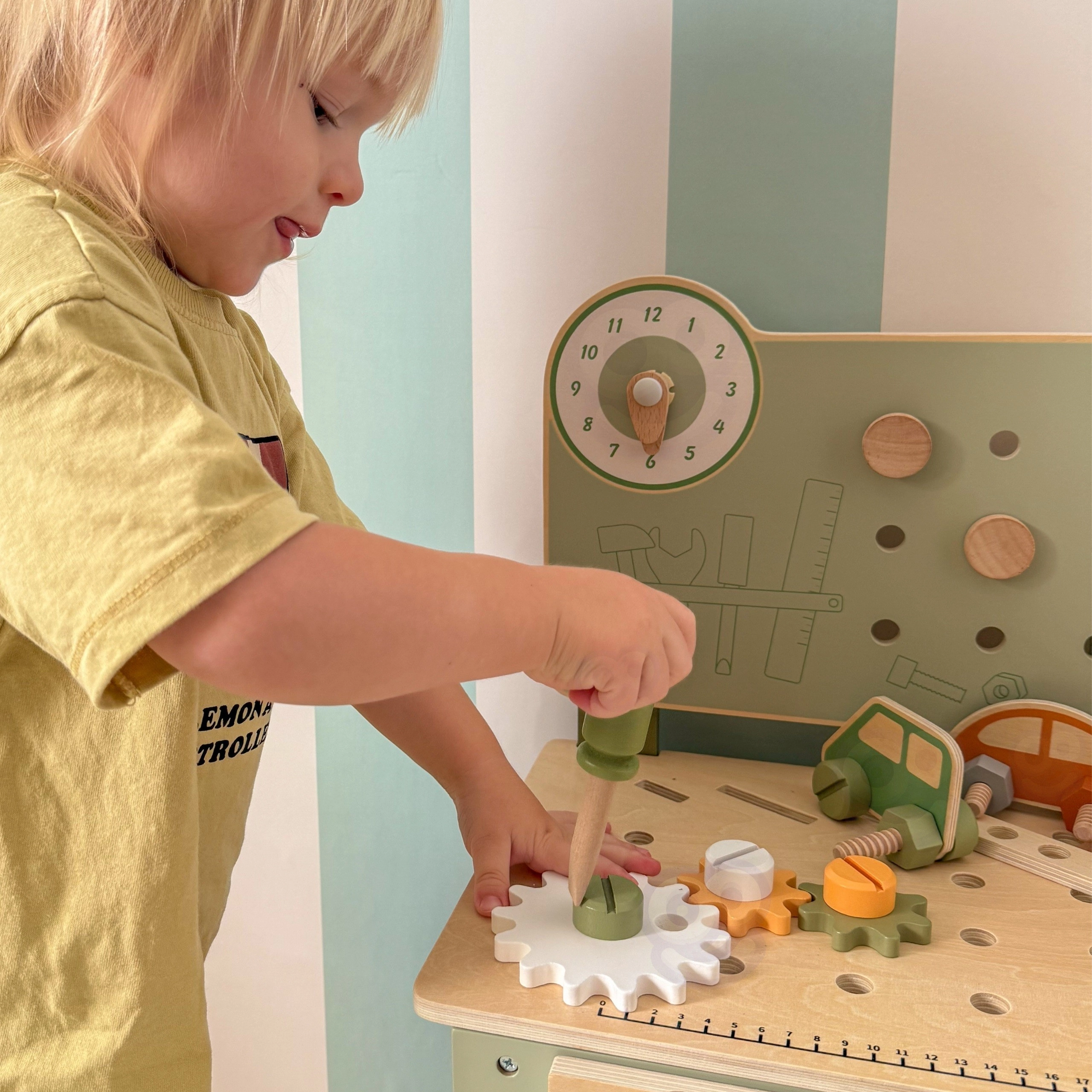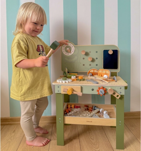 Werkbank mit Lochwand, Messskala und drehbaren Elementen unterstützt realistisches Spielen und den Aufbau von Fertigkeiten im Umgang mit Werkzeugen.