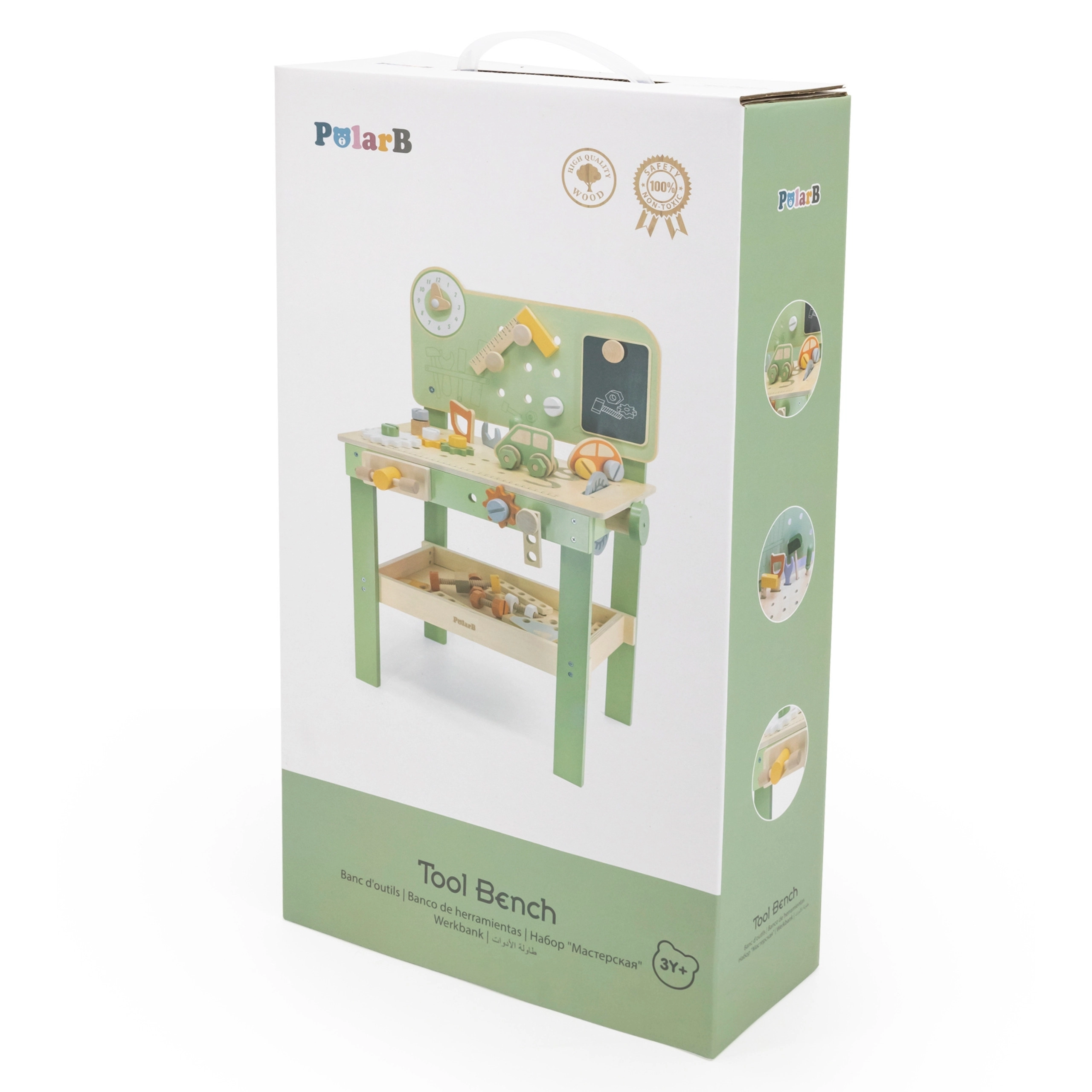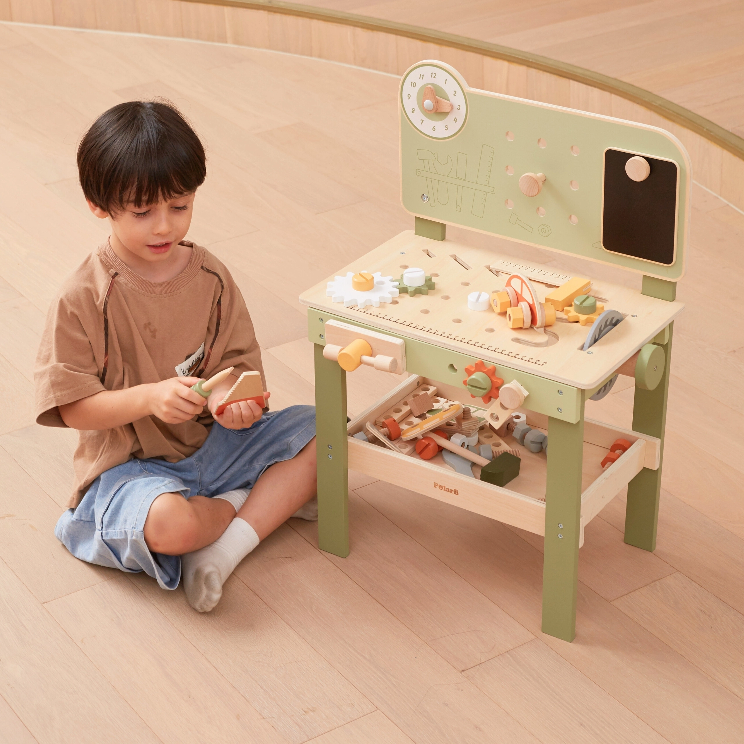 Robustes Holz mit ungiftigen Farben und ein unteres Regal zur Aufbewahrung der Teile sorgen für sicheres und übersichtliches Spielen.