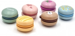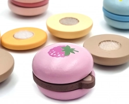 Dieses entzückende Set enthält sechs farbenfrohe Holz-Macarons mit originellen Motiven. Die Teile werden per Klett verbunden, sodass Kinder im Handumdrehen neue Geschmacksrichtungen und Muster „mischen“ können. Ein ideales Zubehör für die Kinderküche, den Laden oder die Spiel-Konditorei.
