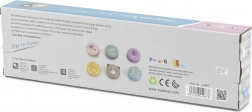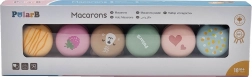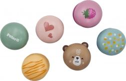 Das Set enthält sechs Macarons in verschiedenen Farben mit verspielten Motiven (Herzchen, Obst, Tierchen), die Fantasie und thematisches Spiel anregen.