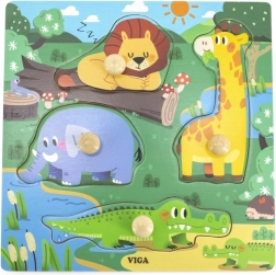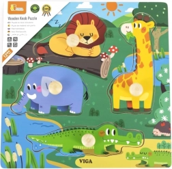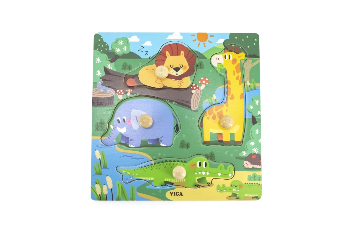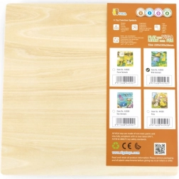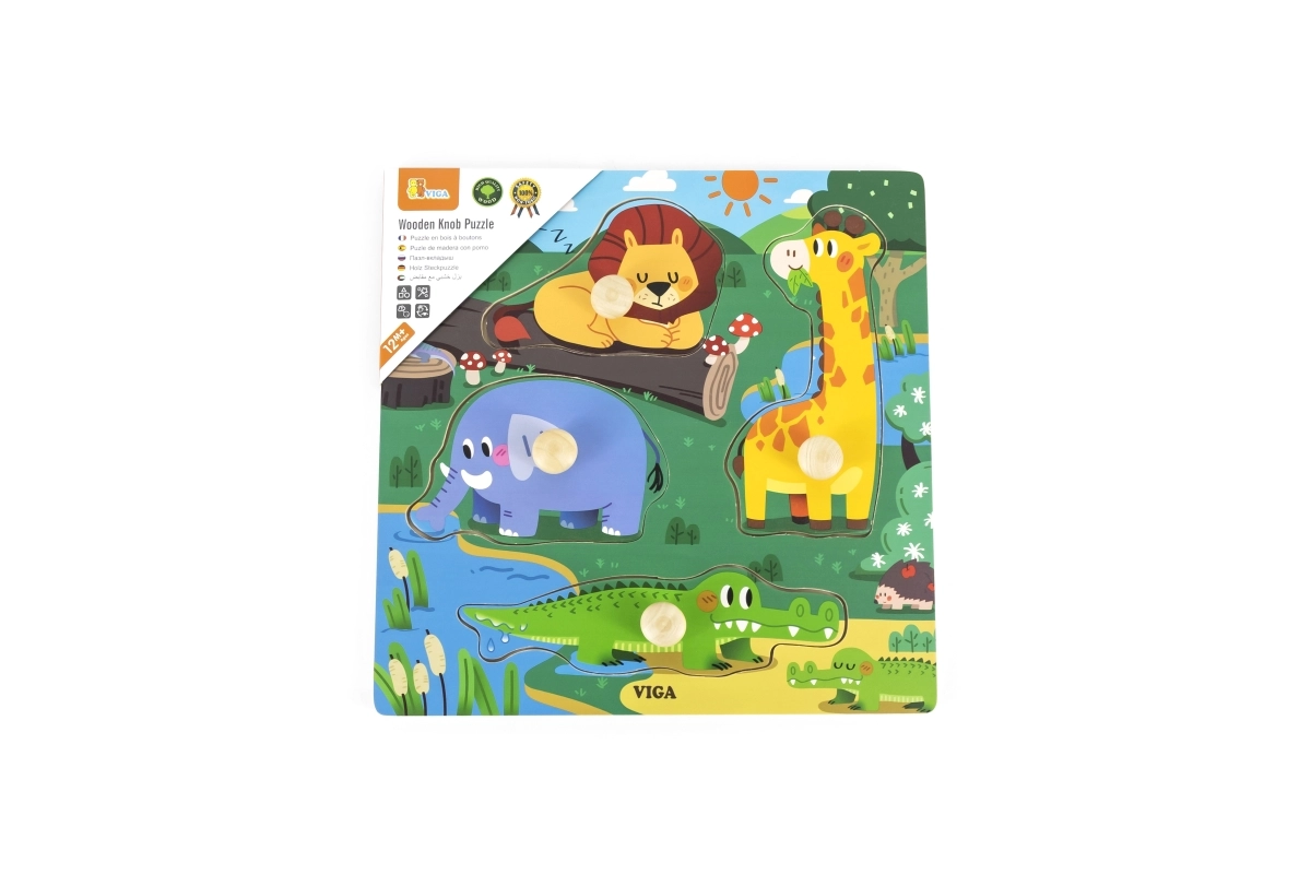 Holzpuzzle mit Wildtieren. Maße der Holzplatte ca. 22,5 × 22,5 cm. Maße der Verpackung ca. 22,5 × 25,5 × 1 cm. Alter 12 Monate+
