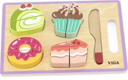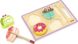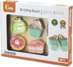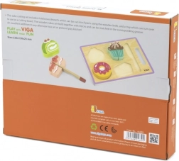 Entdecken Sie kreatives Spielen mit dem VIGA Holzset My Cutting Dessert. Vier bunte Desserts können dank Klettverbindung sicher mit dem Holzmesser in 8 Teile „geschnitten“ und wieder zusammengesetzt werden. Das Tablett lässt sich leicht umdrehen und als Schneidebrett verwenden, was das authentische Spiel in der Kinderküche unterstützt.