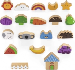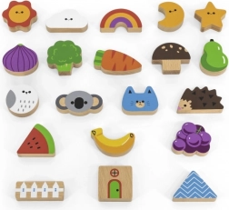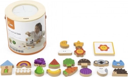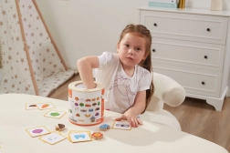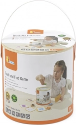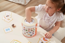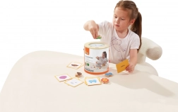 Spiel Fang mich und finde mich. Die Packung enthält 20 Würfel, einen Papier-Eimer, 20 Spielkarten und einen Deckel. Verpackungsmaße ca. 16 × 15,5 cm. Alter 3+