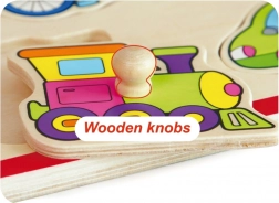 Jedes Teil hat einen Holzknopf, mit dem Kinder die Formen leicht anheben und passgenau einsetzen können – ideal zum Training der Feinmotorik.