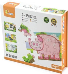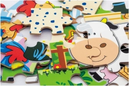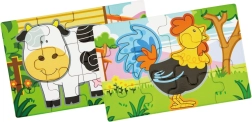 Holzpuzzle mit Bauernhofmotiven. Die Packung enthält insgesamt 4 Bilder (insgesamt 48 Teile). Aus den Puzzleteilen kann ein langes Bild mit allen 4 Tieren zusammengesetzt werden. Verpackungsmaße ca. 20,5 × 19,5 × 4,5 cm. Alter 24m+.