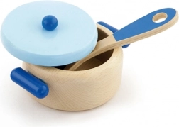 Komplette Ausstattung für das Kochspiel: Topf mit Deckel, Pfanne mit Ei, Löffel, Salzstreuer, Pfefferstreuer und ein Textil-Topflappen. Ideal für die ersten Küchenabenteuer.