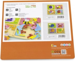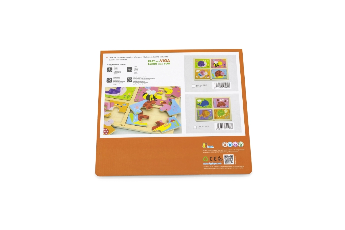 Jedes Puzzle hat sein eigenes Unterlagefeld, was die Orientierung erleichtert und Kindern hilft, schneller Erfolg zu haben. Robuste Holzteile fühlen sich angenehm an, liegen gut in der Hand und halten auch häufigem Gebrauch stand.