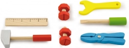 **Inhalt:** Hammer, Schraubenschlüssel, Schraubenzieher, Maßband, Schrauben und Muttern, Zange.