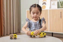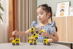 Jedes Fahrzeug hat funktionale Räder für sanftes Rollen, und einige Teile deuten bewegliche Elemente an (z. B. Schaufel, Trommel oder Kran), was natürliche Neugier sowie die Hand-Auge-Koordination fördert.