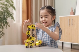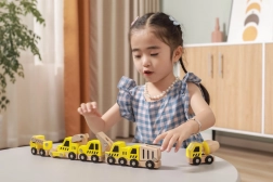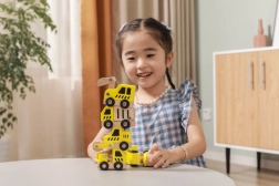 Dieses hochwertige Set enthält 6 verschiedene Baufahrzeuge in leuchtendem Gelb mit natürlichen Holzelementen – ideal für erste Rennen über den Boden und das Spielen auf der Baustelle. Dank der abgerundeten Formen und der robusten Holzkonstruktion sind die Autos sicher und angenehm zu berühren.