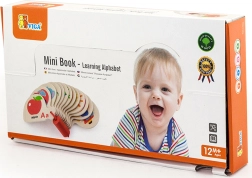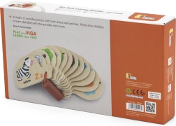 Das Set aus Holzkarten, verbunden mit einer roten Schnur, enthält auf jeder Karte verschiedene Bilder, Buchstaben und englische Bezeichnungen. Dieses Spielzeug bringt Kindern Buchstaben bei, fördert die Feinmotorik und bietet erste Wörter auf Englisch.