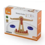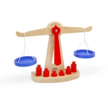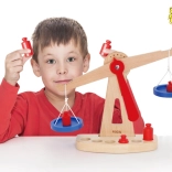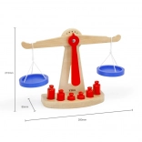 Die Waage hat ein natürliches Holzdesign mit roten und blauen Akzenten, die sie für jedes Kind visuell attraktiv machen.