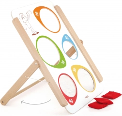 Das Spiel enthält einen Ständer mit Holzrahmen und drei Bohnenbeutel, die dank der klappbaren Konstruktion leicht transportiert werden können.
