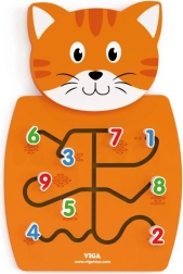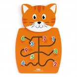 Holzkatze mit Labyrinthen zum Bewegen von Zahlen und zur Förderung der Feinmotorik.